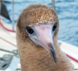 Un soir, une bande de sorte de canards m'envahissent. Un s'accroche à la girouette en tête de mât, un dans le balcon avant, un autre au bout du tangon de spi, un sur le panneau solaire et un sur le pont. Pas gênés et pas effrayés du tout. L'un d'eux va passer la nuit sur le balcon avant. Il s'envolera au levé du soleil. |